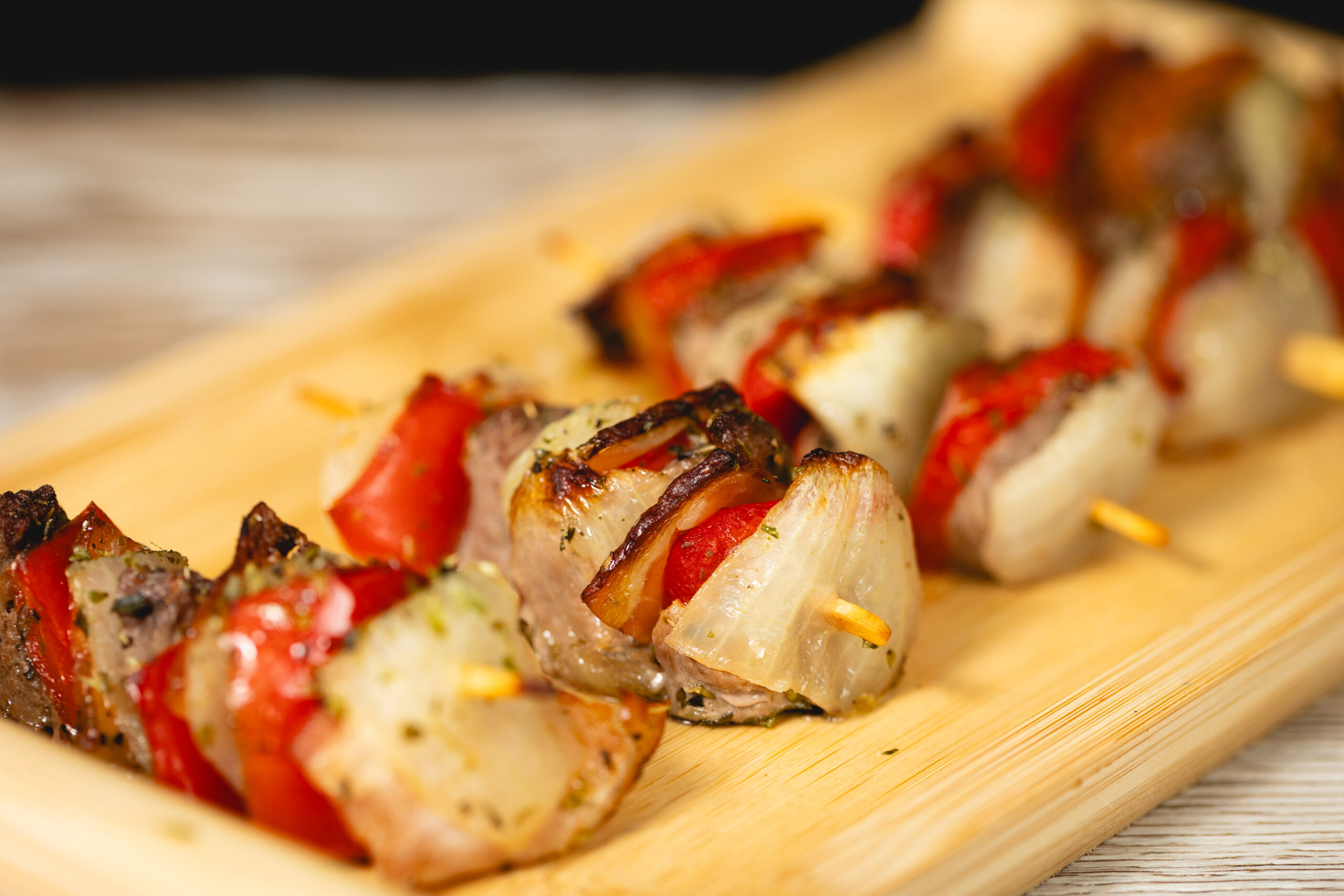 Pincho de cerdo con cebolla, morrón y panceta