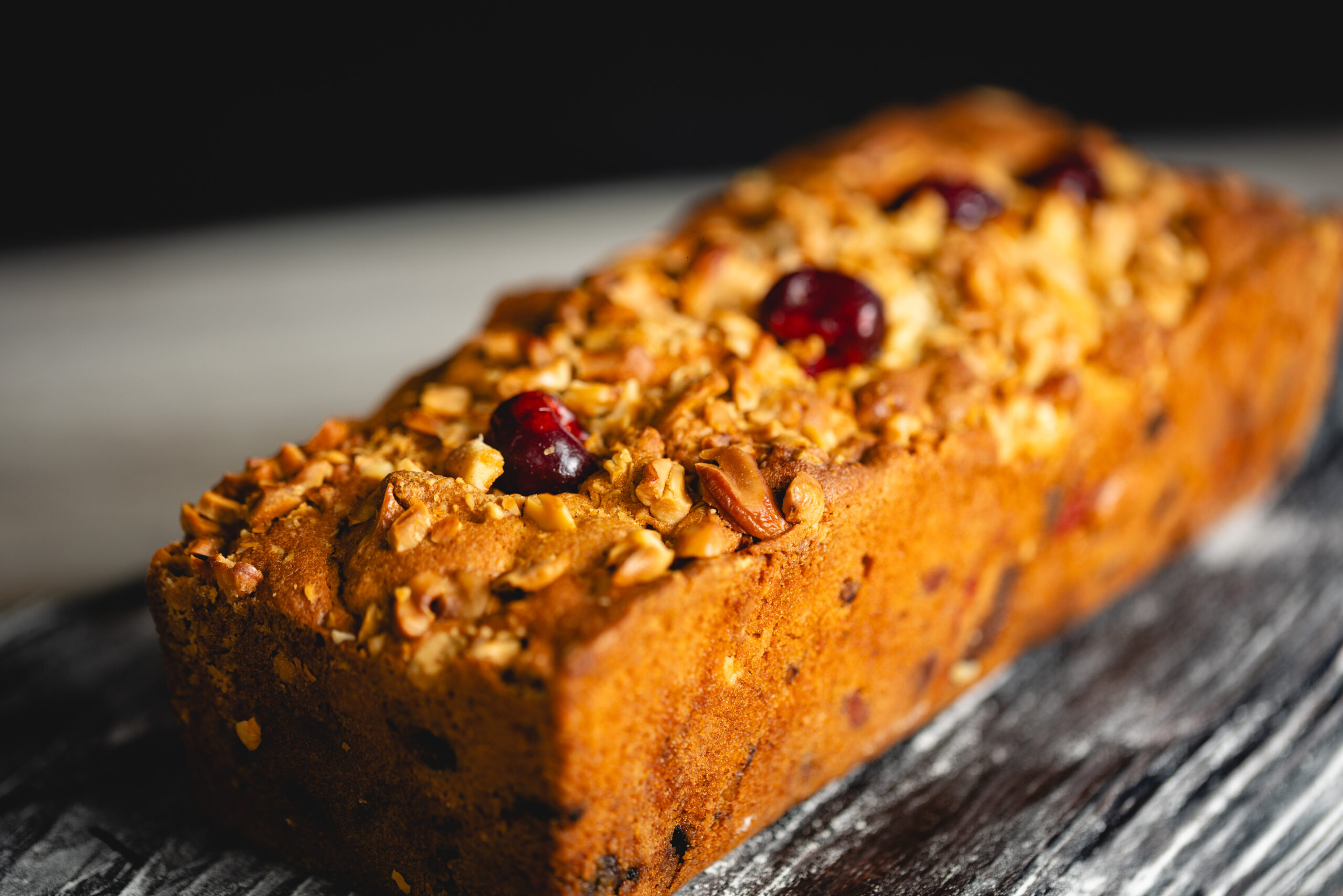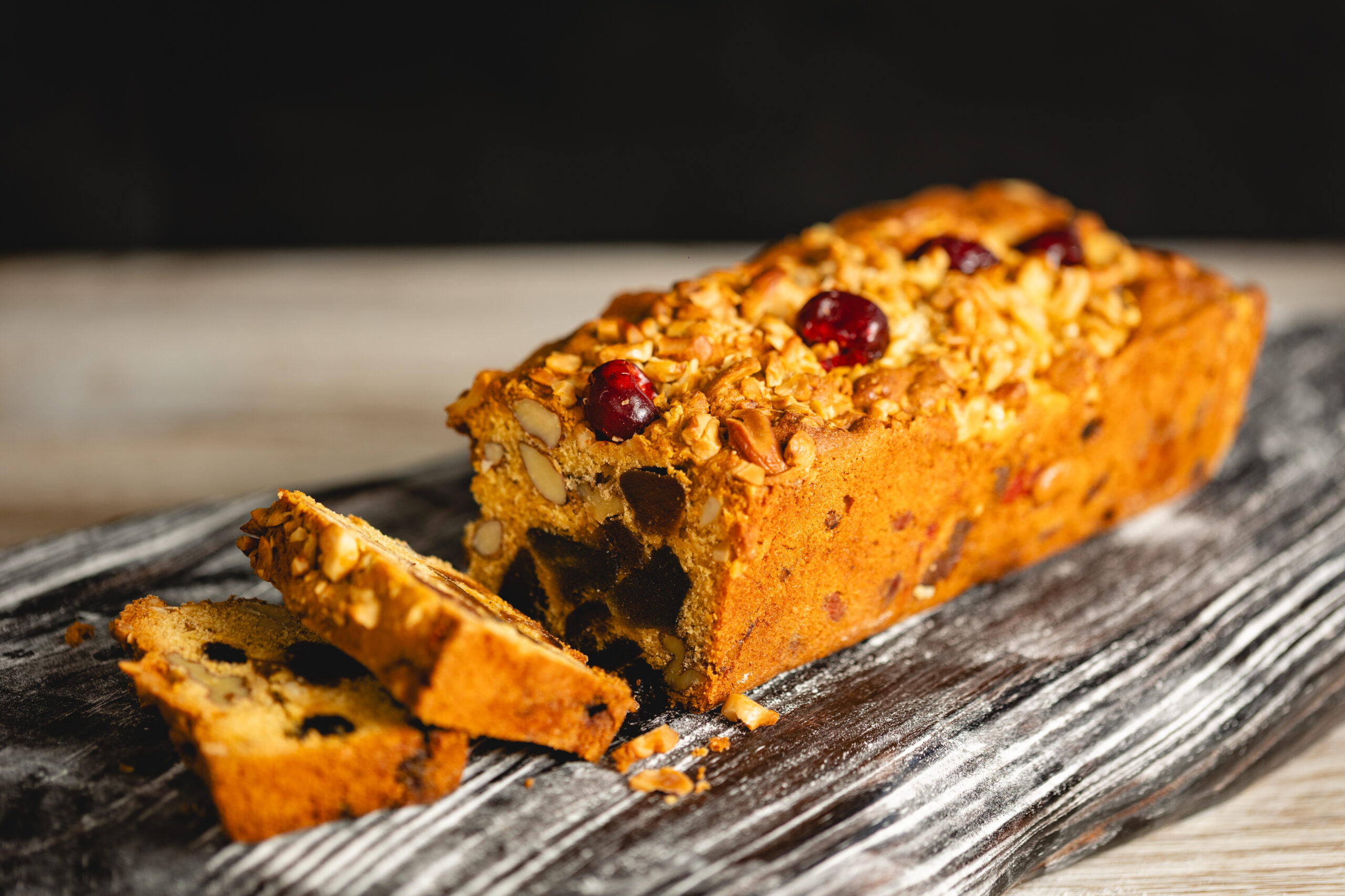 Budín Inglés tradicional con: fruta abrillantada, nueces, castañas de cajú, pasas de uva, cerezas, almendras y avellanas.