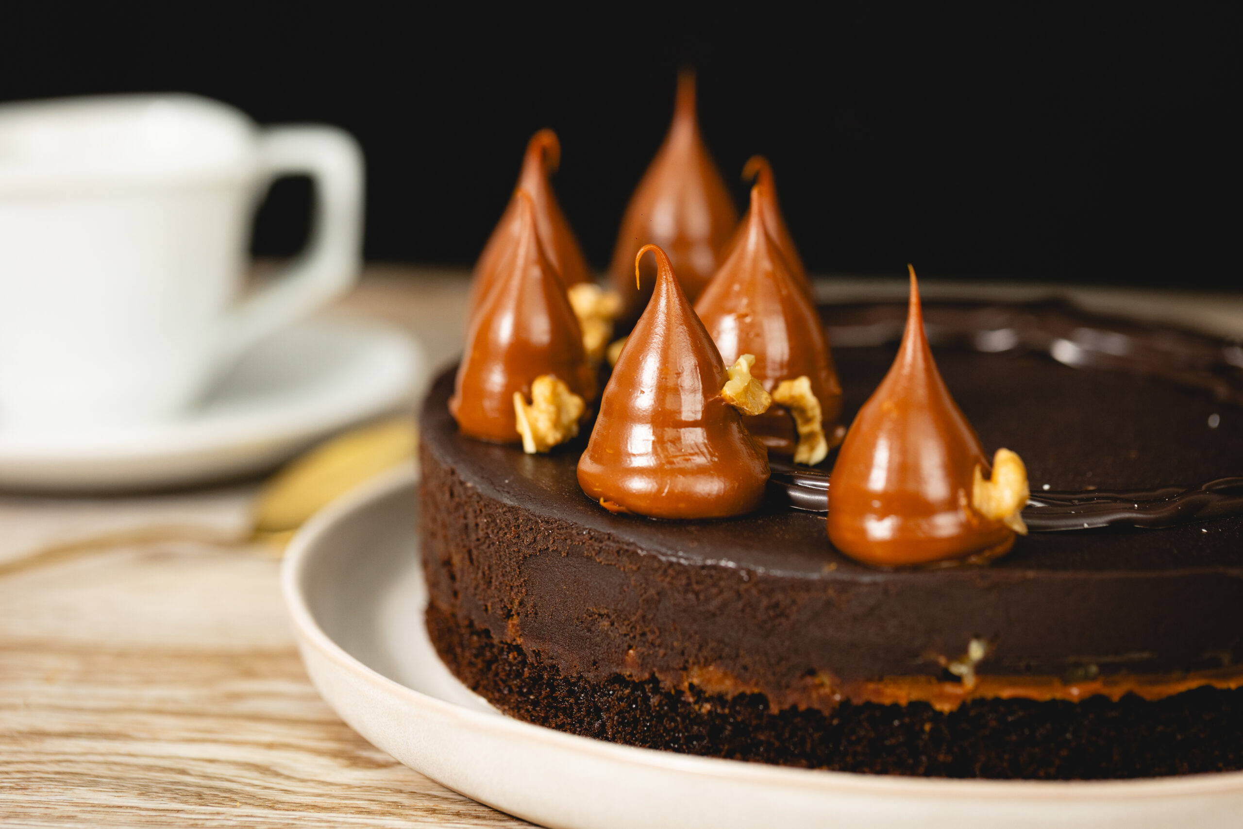 Base de negra maluca, capa de dulce de leche con nueces picadas y ganache de chocolate semiamargo.