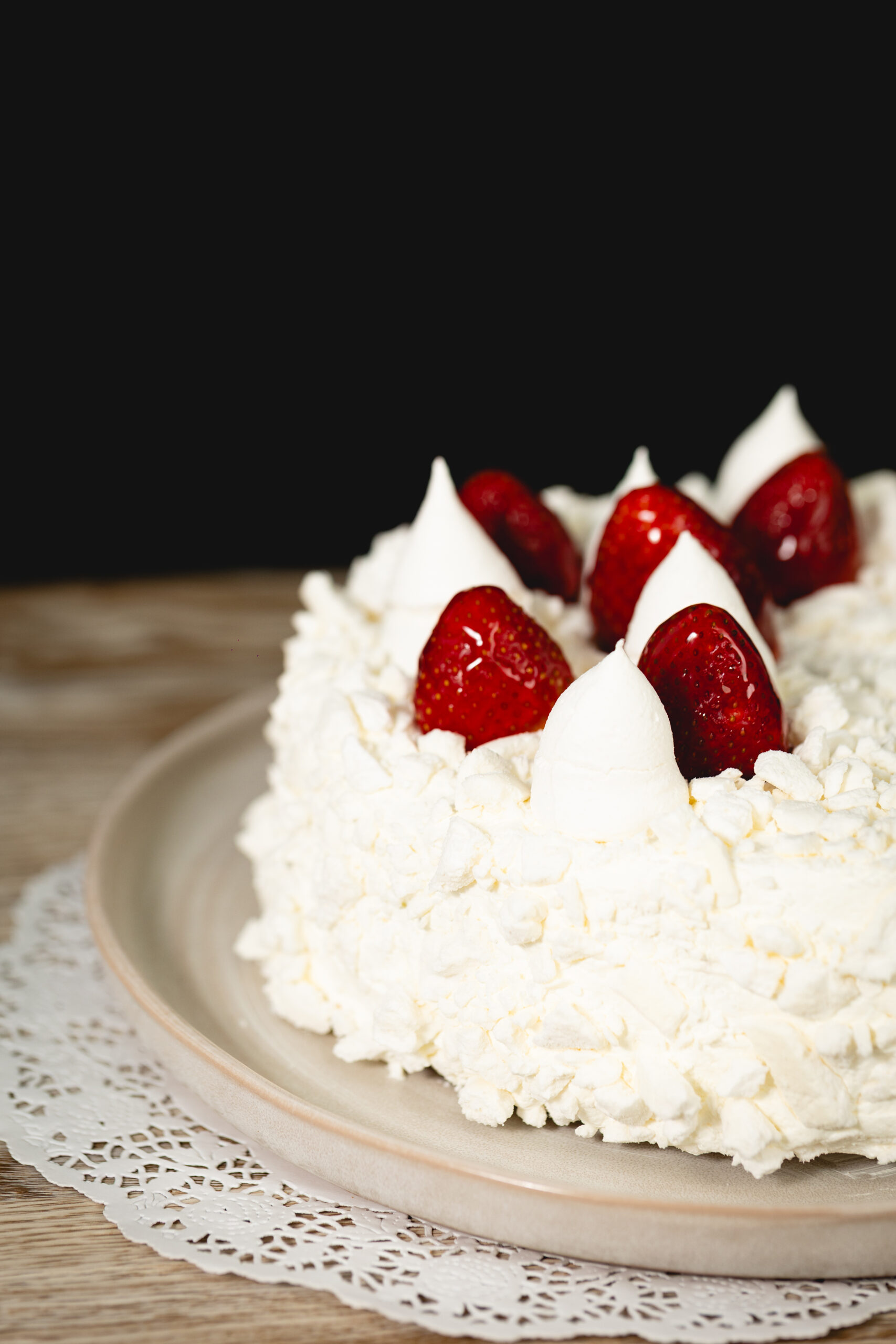 Bizcochuelo de vainilla relleno con chantilly y frutillas y bañado con chantilly decorado con frutillas.