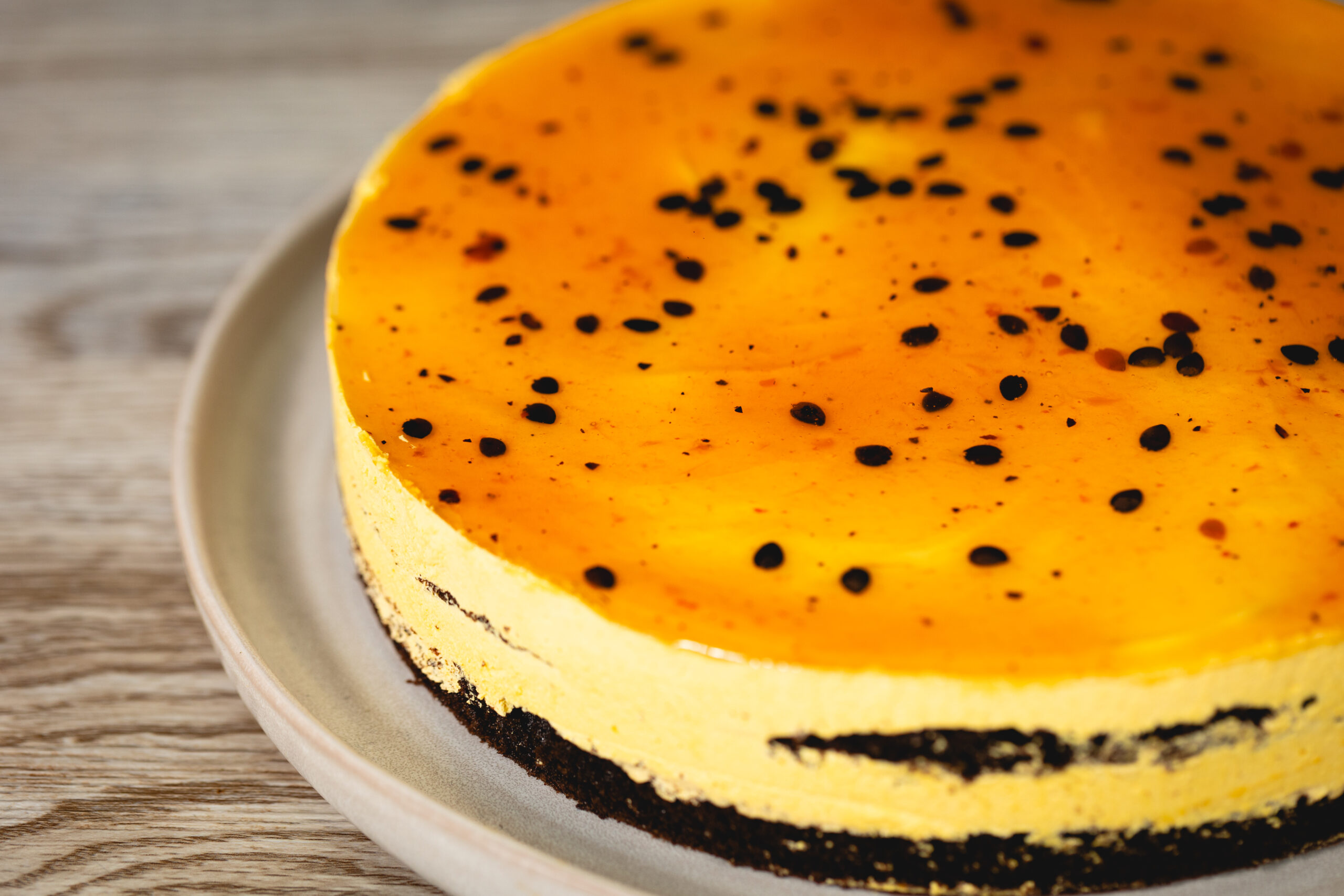Base tipo brownie con mousse de maracuyá.