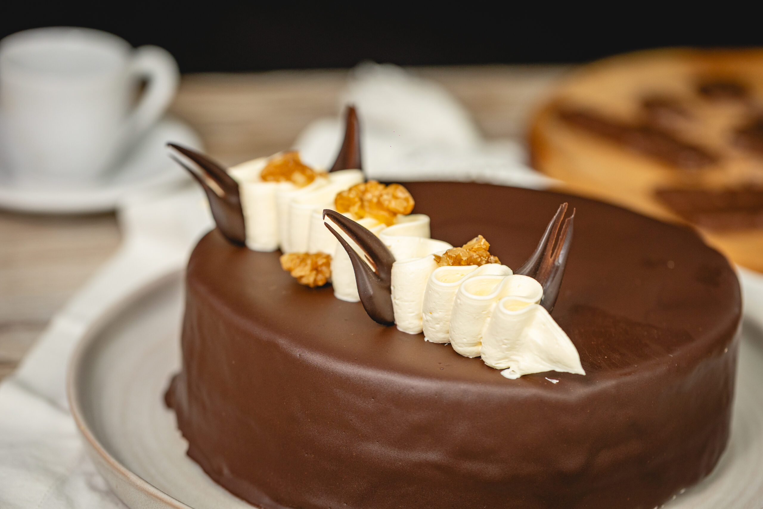 Bizcochuelo de chocolate relleno de dulce de leche con nueces picadas bañado en chocolate semiamargo y decorado con figuras de chocolate y ganache de chocolate blanco.