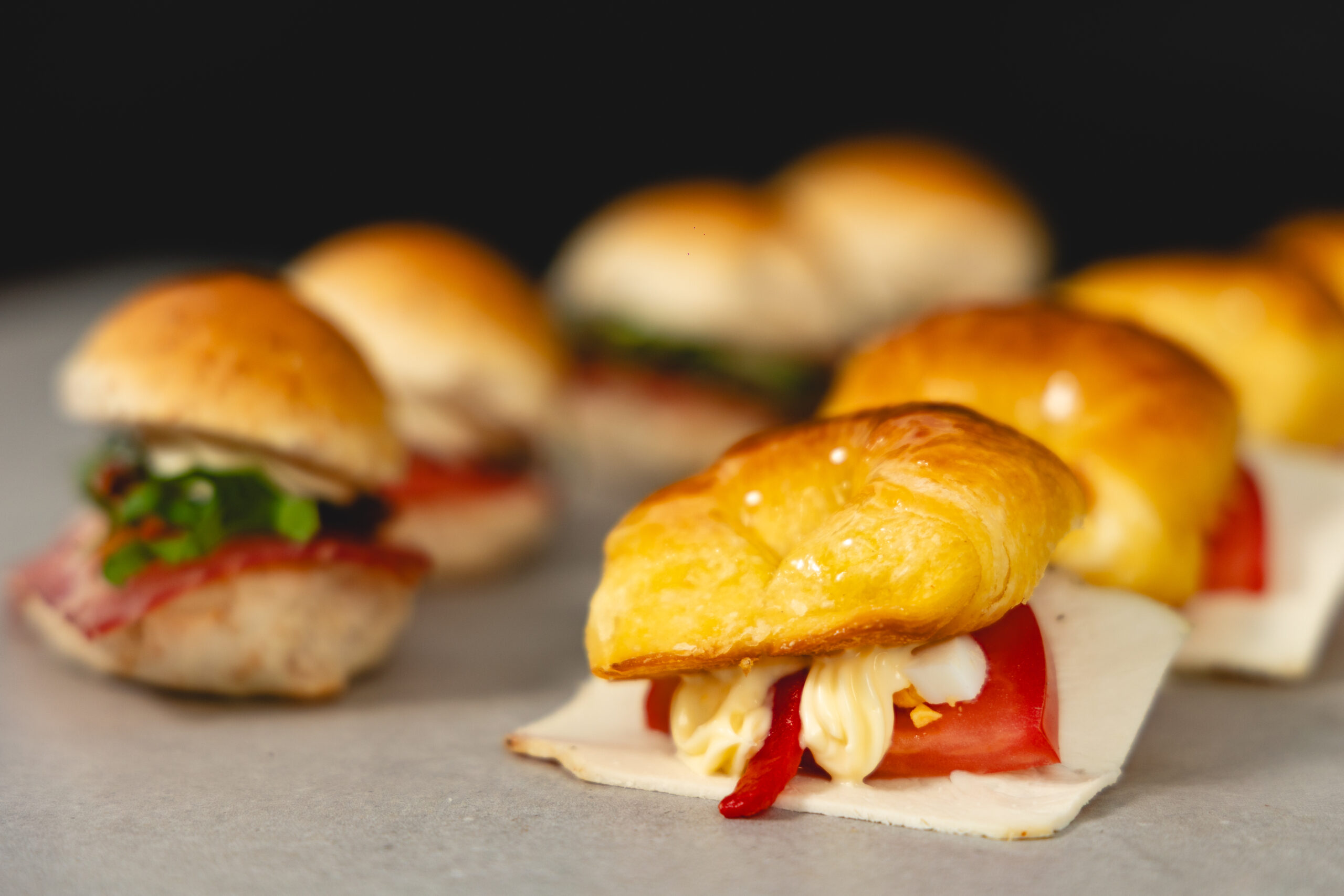 Medialunitas de manteca de copetin rellenas con: pavita, lechuga, tomate, huevo y morrón.