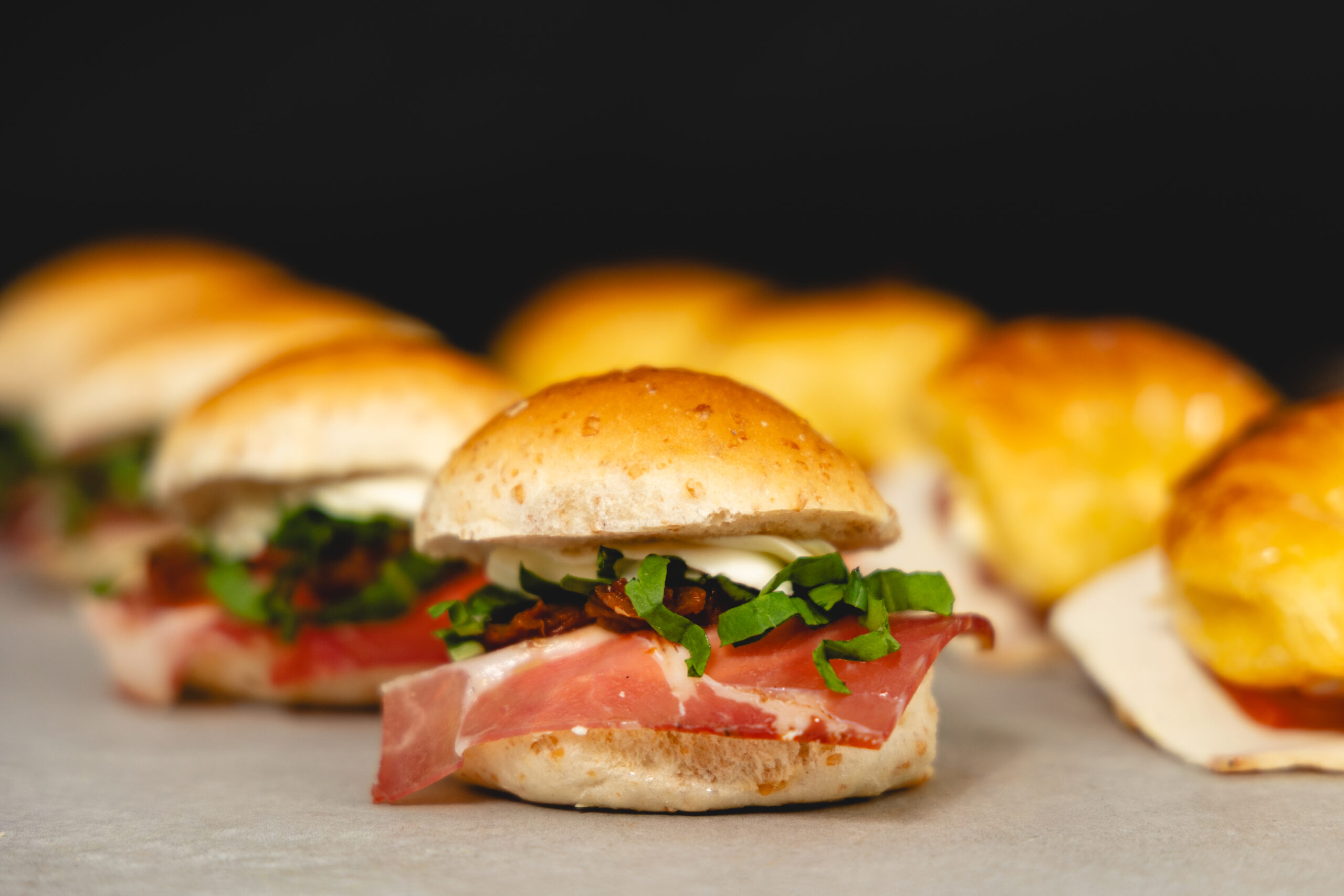 Pebetes integrales rellenos de queso crema, bondiola, tomate seco y rúcula.