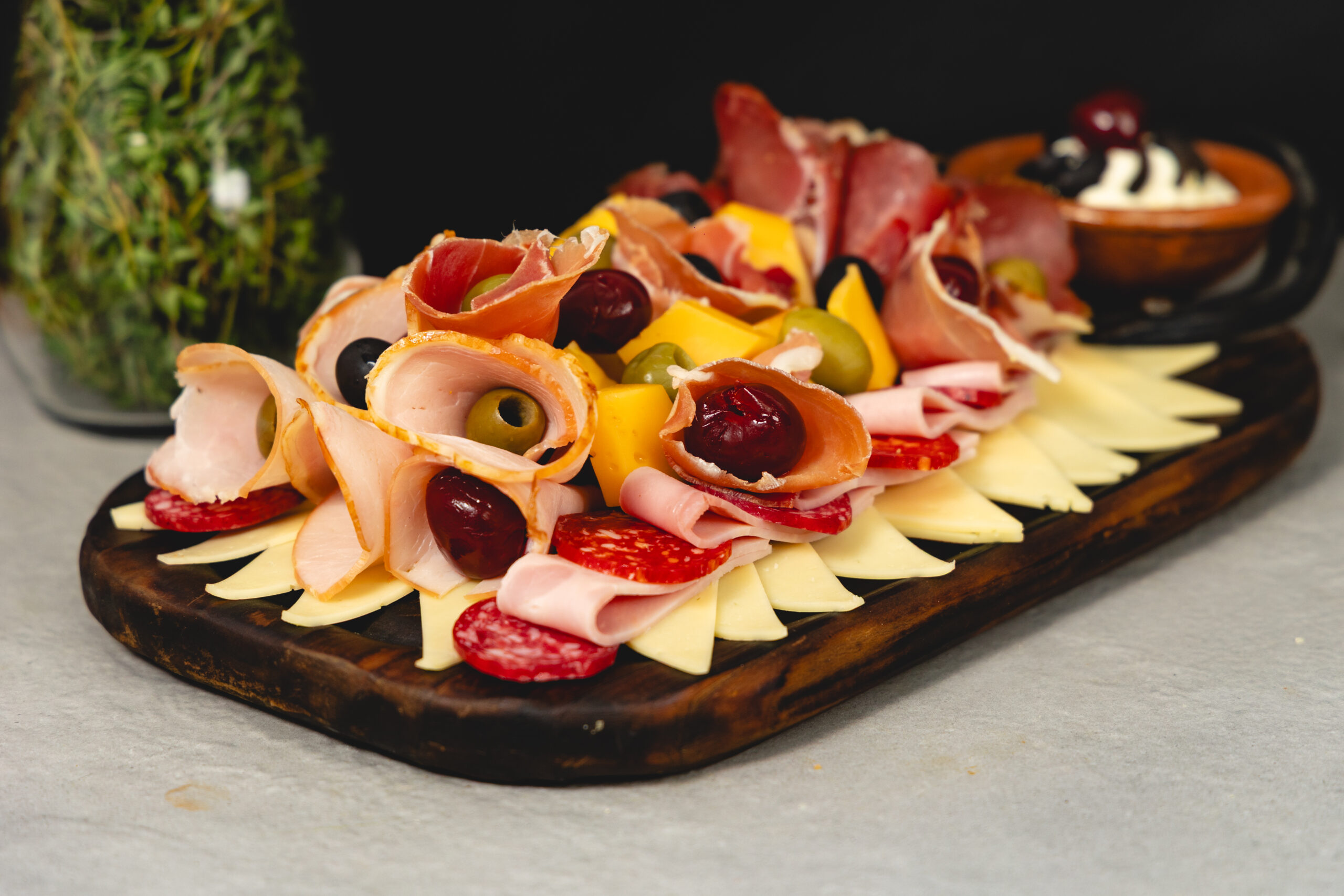 Fiambres y quesos seleccionados: jamón cocido, jamón crudo, lomito, bondiola, salamín, queso dambo, queso colonia, queso crema; acompañado de pancitos y grissines.