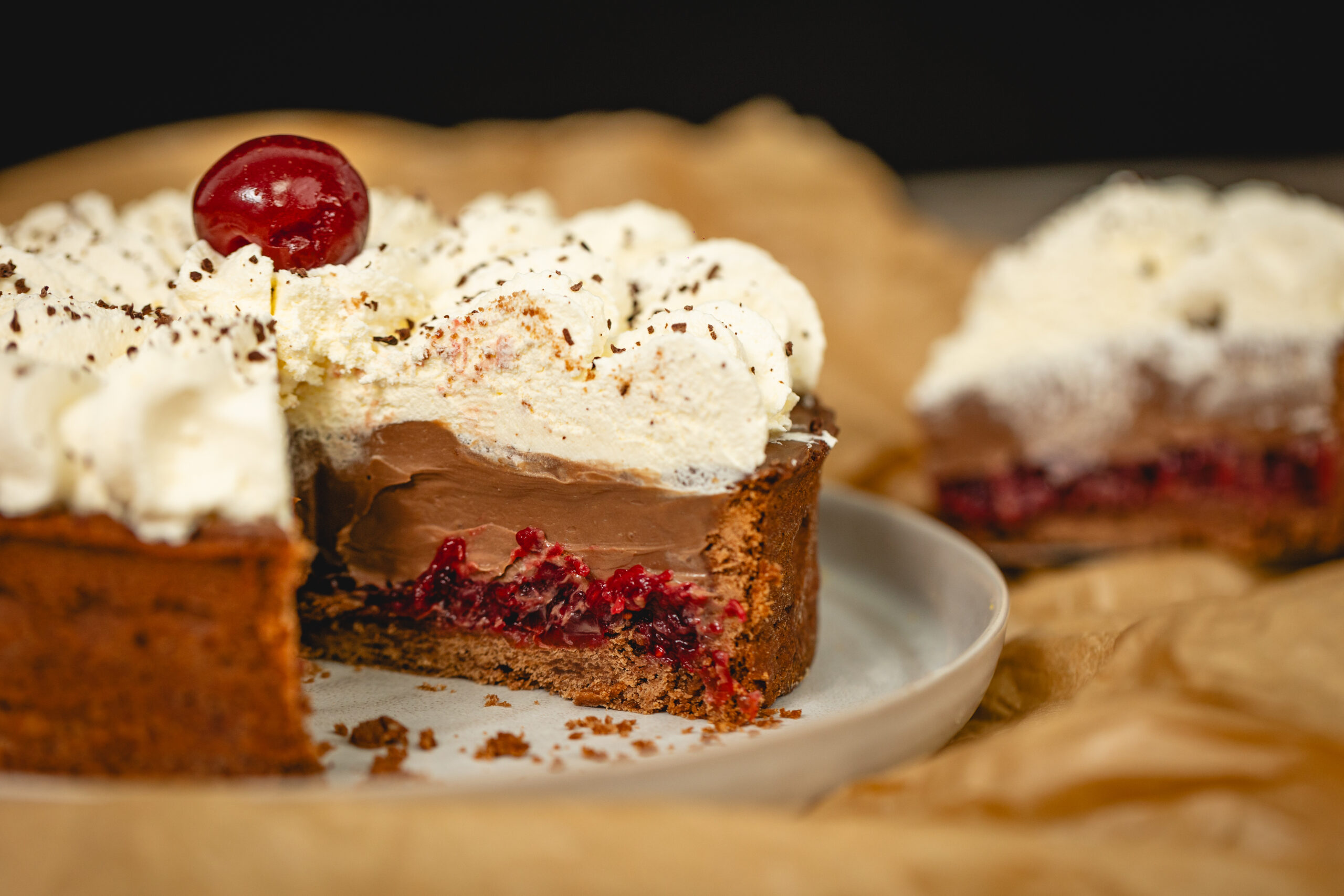 Tarta de masa sable de chocolate relleno con mermelada de frambuesas y cerezas, fina capa de mousse de chocolate con leche y decorado con crema chantilly y viruta de chocolate.