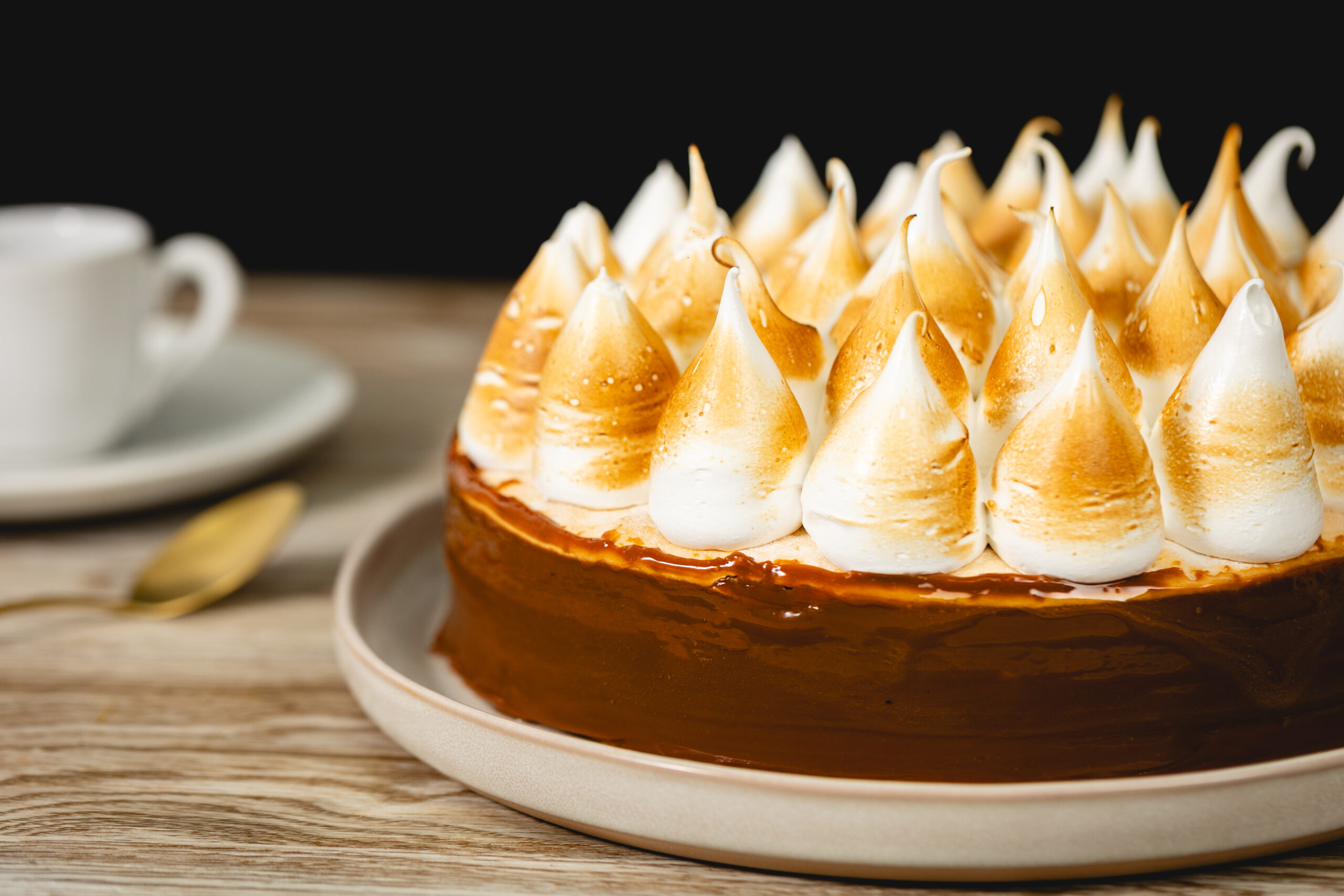 Finas capas de masa de alfajor unidas por dulce de leche, bañada en dulce de leche con copos de merengue quemado.