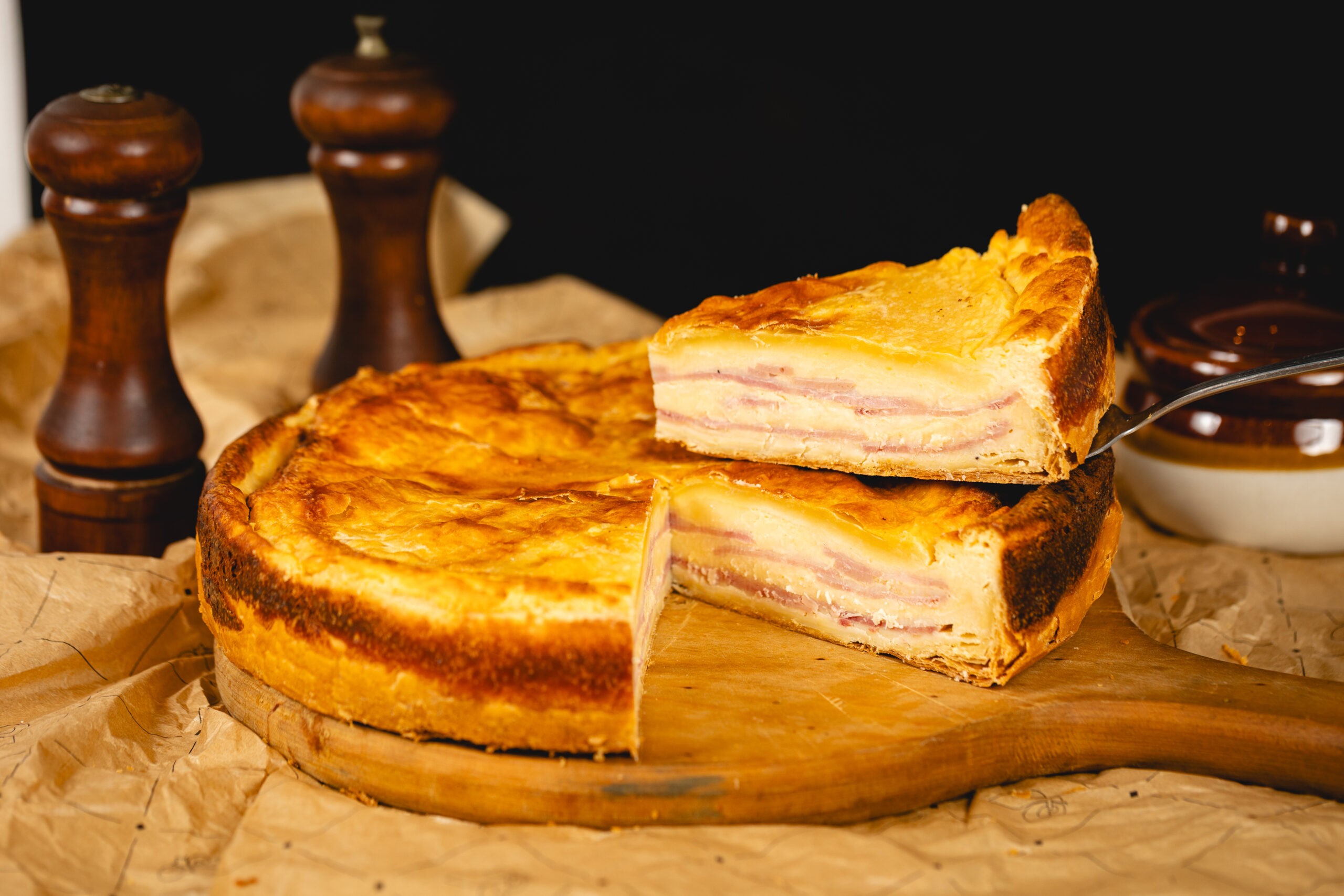 Torta de masa hojaldre rellena de jamón y queso con quiche a base de crema doble y queso crema.